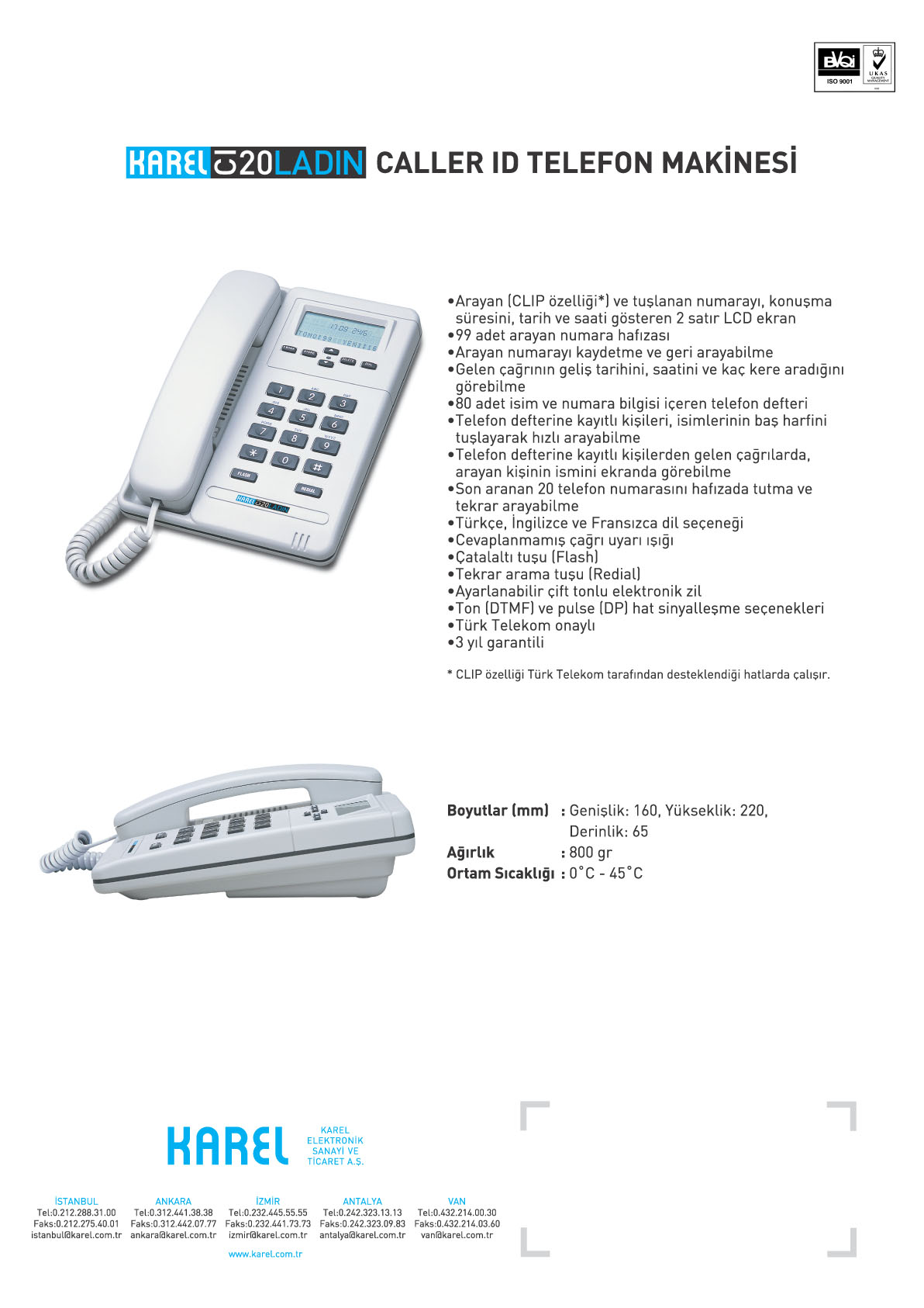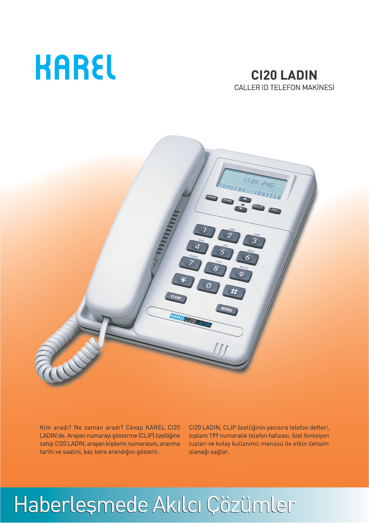 Arayan (CLIP özelliği) ve tuşlanan numarayı, konuşma süresini, tarih ve saati gösteren 2 satır LCD ekran.